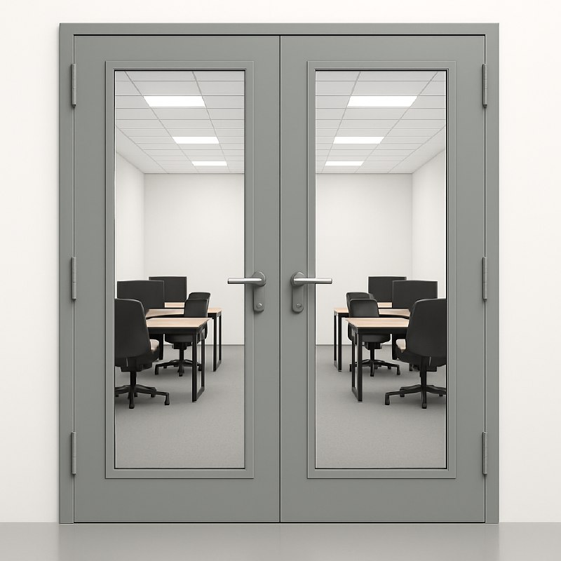 Двупольная противопожарная дверь с остеклением обеспечивает надежную защиту и визуальный контроль. Конструкция состоит из двух распашных створок с огнестойким стеклом, что позволяет сохранять герметичность и высокую огнестойкость. Такая дверь подходит для входов в техподдержку, офисы и зоны с требованием к безопасности и освещенности. Надежна, долговечна и соответствует стандартам пожарной безопасности.